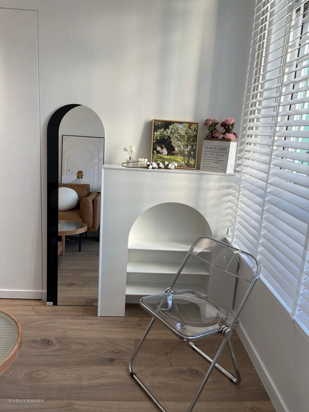 客厅选择安装了百叶窗,颜值非常高。透过百叶窗一丝丝的光线可以照射进来,若隐若现的效果,很有意境。旁边放着一个壁柜,加上一面全身镜,可以作为女屋主的梳妆区,不影响使用哈。透明的椅子很喜欢,效果特别抢眼。可以看出来,屋主的审美还是蛮不错的,非常时尚。