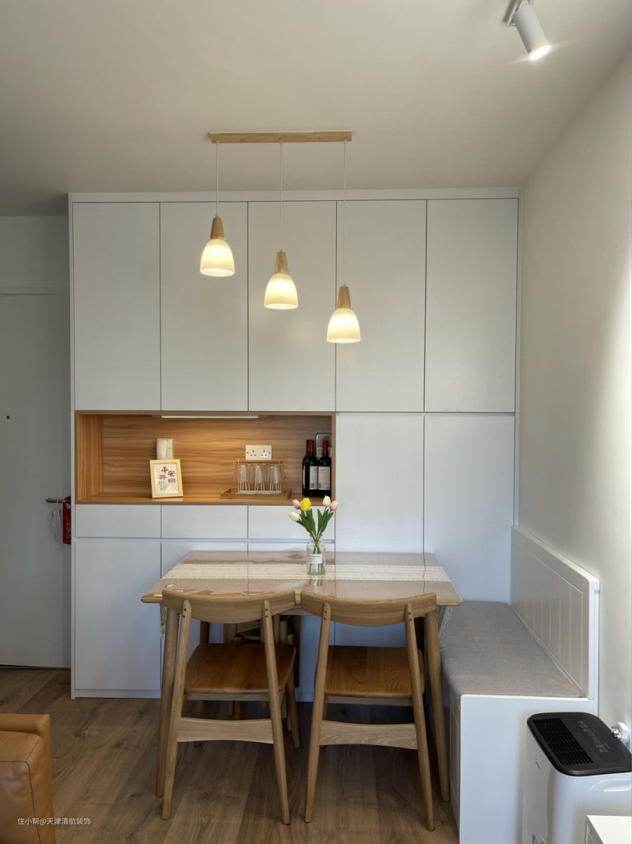 一进屋就是餐厅,没有玄关的说法。入户大门右边定制了上下两层的储物柜,既作为餐边柜,也是作为鞋柜,使用非常方便。中间留空位置,并且安装了插座,方便以后生活。中间可以放茶杯,包括直接摆放几瓶酒,也是足够空间收纳起来。布置一张小方形餐桌,实木的款式,非常环保。为了更好把空间利用起来,设计了卡座,方便坐着用餐的同时,可以提供更多的储物空间。卡座上放着坐垫,坐着会更舒服。本来空间就小,在装修的时候,尽量把每寸空间利用起来。顶面安装三盏式的吊灯,晚上空间照明足够,不刺眼,很温馨。