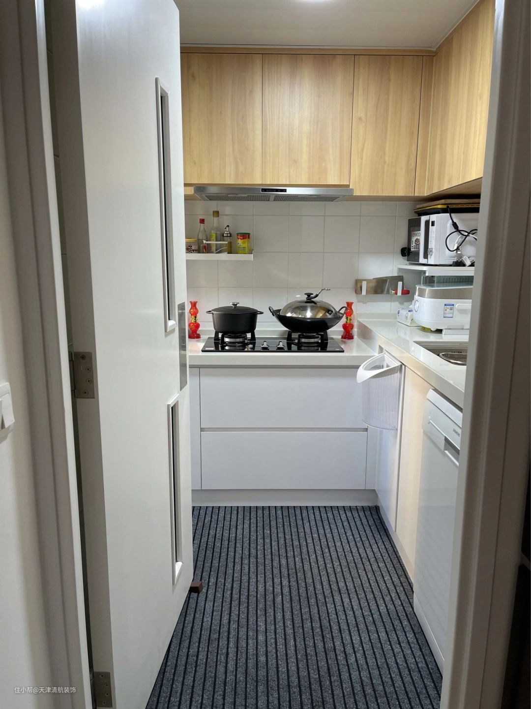 厨房定制了“L”字型高低台面的橱柜,小小厨房能满足三餐四季。上面的吊柜是原木色,而下面的橱柜是白色,搭配起来显得没那么单调。地面放着地毯,灰色非常耐脏,而且防滑吸水。