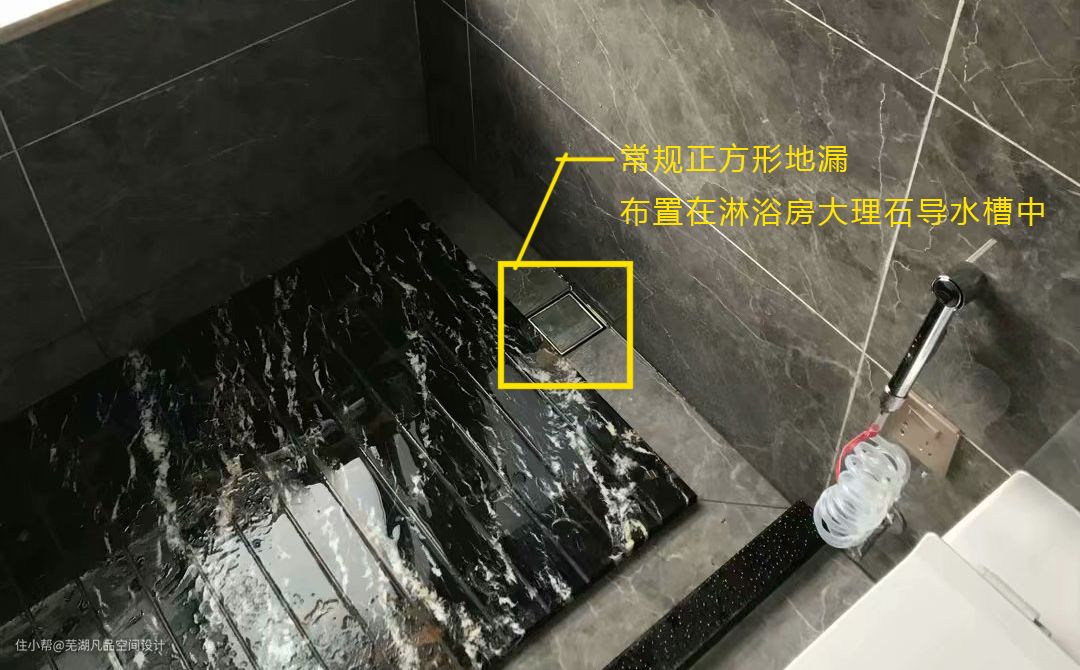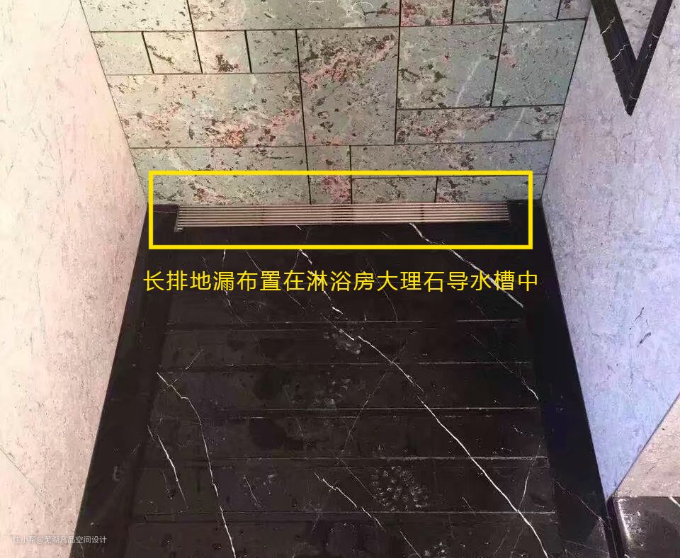在这里要特别说明一下,淋浴房如果是有大理石导水槽的情况下,常规地漏一般位置都会定在导水槽处,另外长排型地漏都是可以使用的;