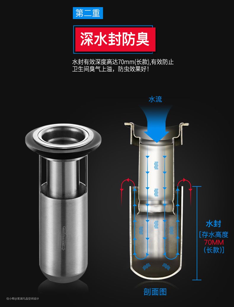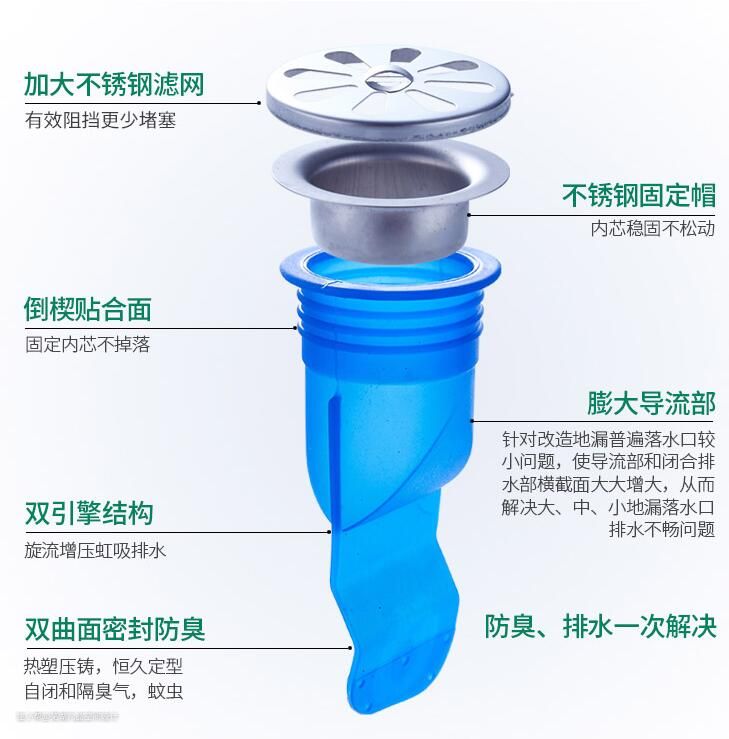这种类型的防臭原理就是利用一个存水高度让管道里的细菌和气味与室内隔绝,一般这种地漏内芯的高度都比较高,所以在地漏不移位的情况下可以使用,效果还是很好的~