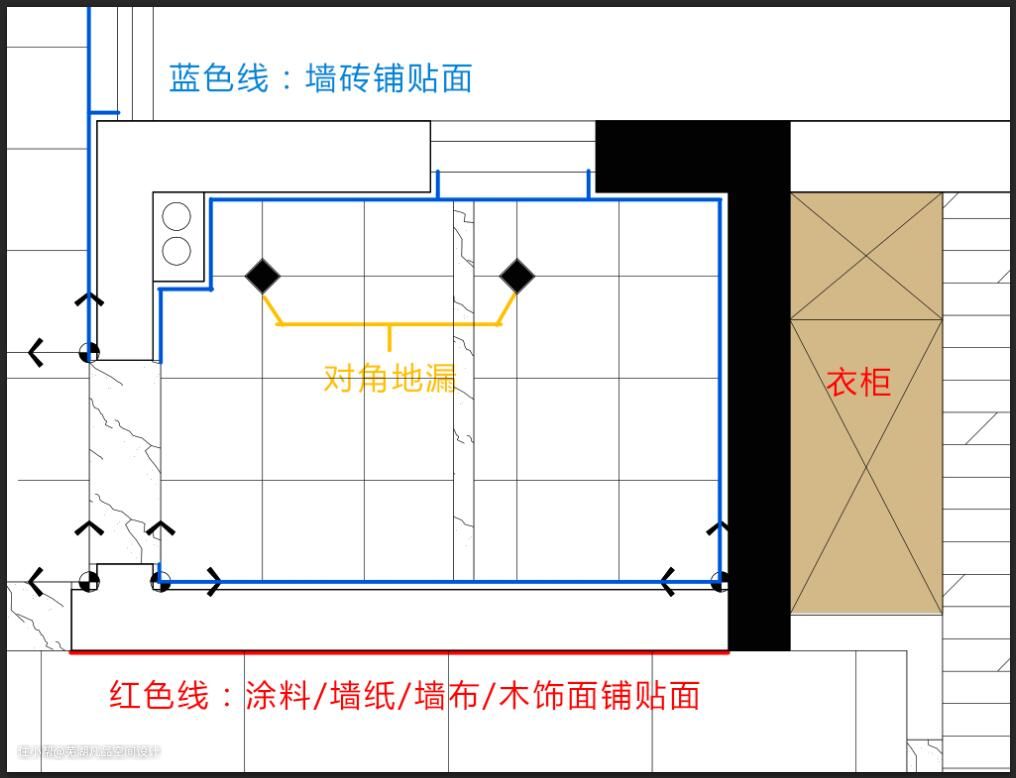 因为地漏处是长时间水流区域,砖砌墙面万一前期的防水层施工不当,后期积水就会渗到墙面背面造成家具、墙纸、墙布受潮!
