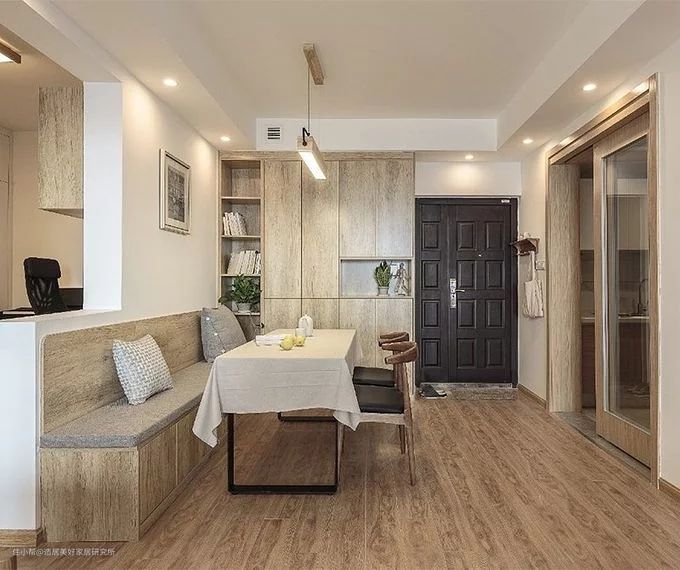 一种是入户大门在客餐厅中间位置,在这种情况下没有玄关,一般会选择在客厅或者餐厅临近大门的墙面做鞋柜,或者选择大门的任意一侧做隔断式鞋柜,而这种鞋柜一般不做全封闭,会留部分透光的地方,在营造神秘感的同时兼顾空间的通透;还有一种则是入户大门进来就是餐厅,一般会在墙面面积大的一侧做鞋柜与酒柜的组合功能柜,或者在面积小的一侧放一个简易鞋柜。