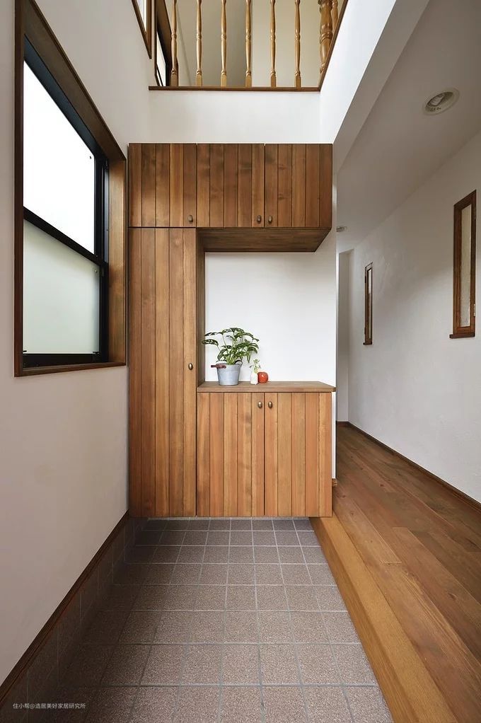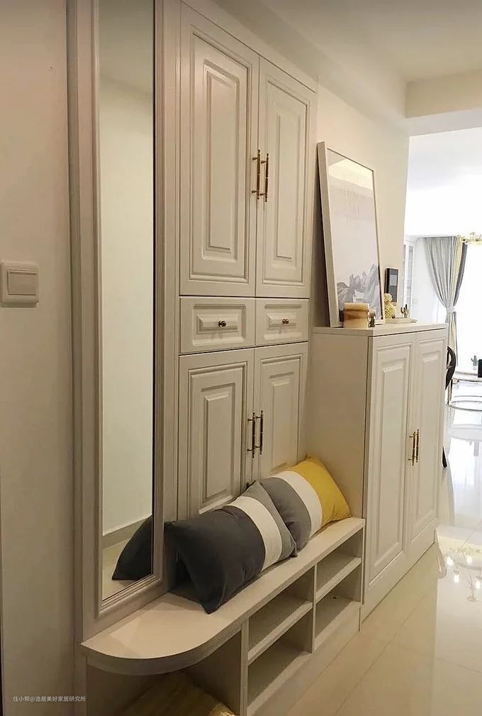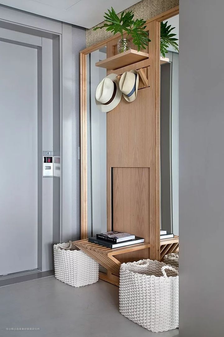 大概到腰部的高度,设置留白空间,做一个台面,这样回到家后,钥匙和包可以顺手放置在这个台面上,然后可以手扶在上面,弯腰拖鞋,这一系列动作会非常流畅。