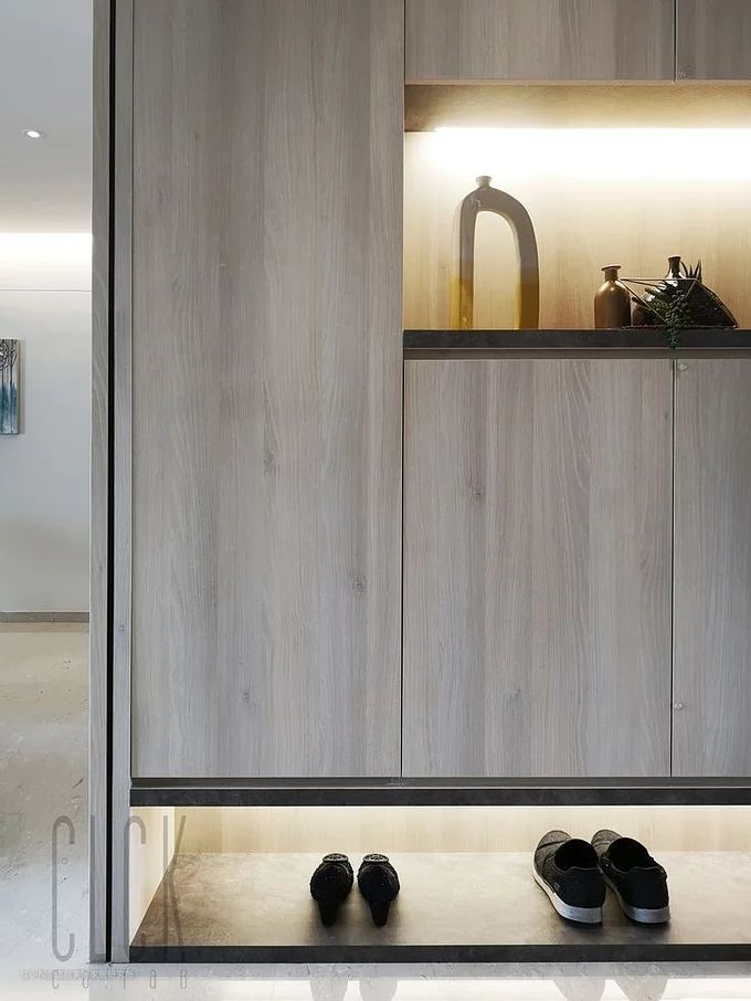 鞋柜底部留15—20厘米的空白,可以用来收纳日常更换的鞋子,保持玄关的整齐美观,同时减少开关鞋柜门的动作,而且对于懒人非常的“友好”,鞋子一脱,用脚推进鞋柜底部空间,连用手都不用。