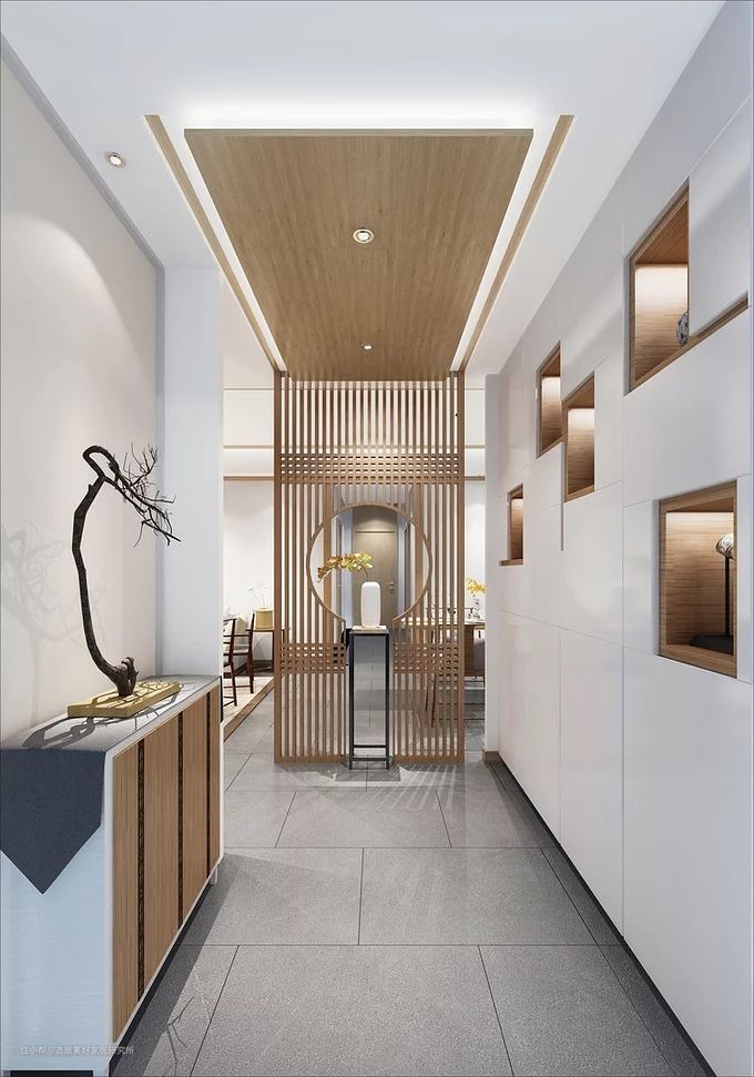 这类型的玄关是最好玄关户型之一,有效的保护隐私,也让室内更具神秘感,同时会在入户大门正对面做一个端景台,摆上装饰品,这也是最考验品位与审美,不过也有人会直接把鞋柜做在大门对面,进门伸手放钥匙和包,然后换鞋等,一套动作非常的流畅舒适。