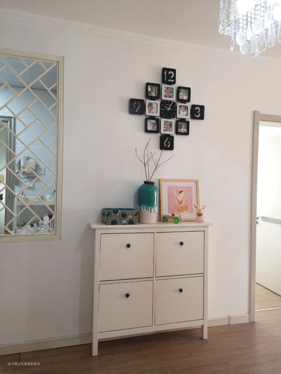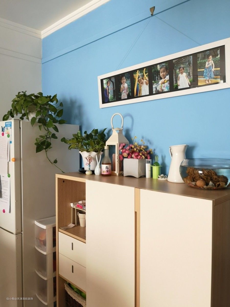 柜子很小,墙面刷了蓝色,相当于背景墙,视觉上看着没有那么单调。墙上挂着家里小孩的照片,可以说见到了这个家的成长。柜子上面放着很多小物件的东西,不会乱,看着都很舒服。家就是如此,要按时收拾整理干净。