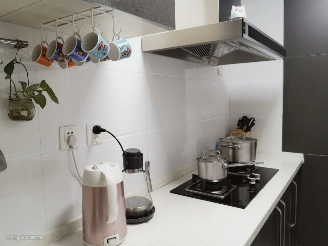 基本能利用的空间都利用起来,墙上安装了置物架,很多小东西都可以挂起来,使用到的时候一眼可以看出来了。安装的水龙头可以拉伸,360°无死角,非常方便使用。大大小小的东西,能收纳起来就尽量收纳起来,保持厨房整洁干净。