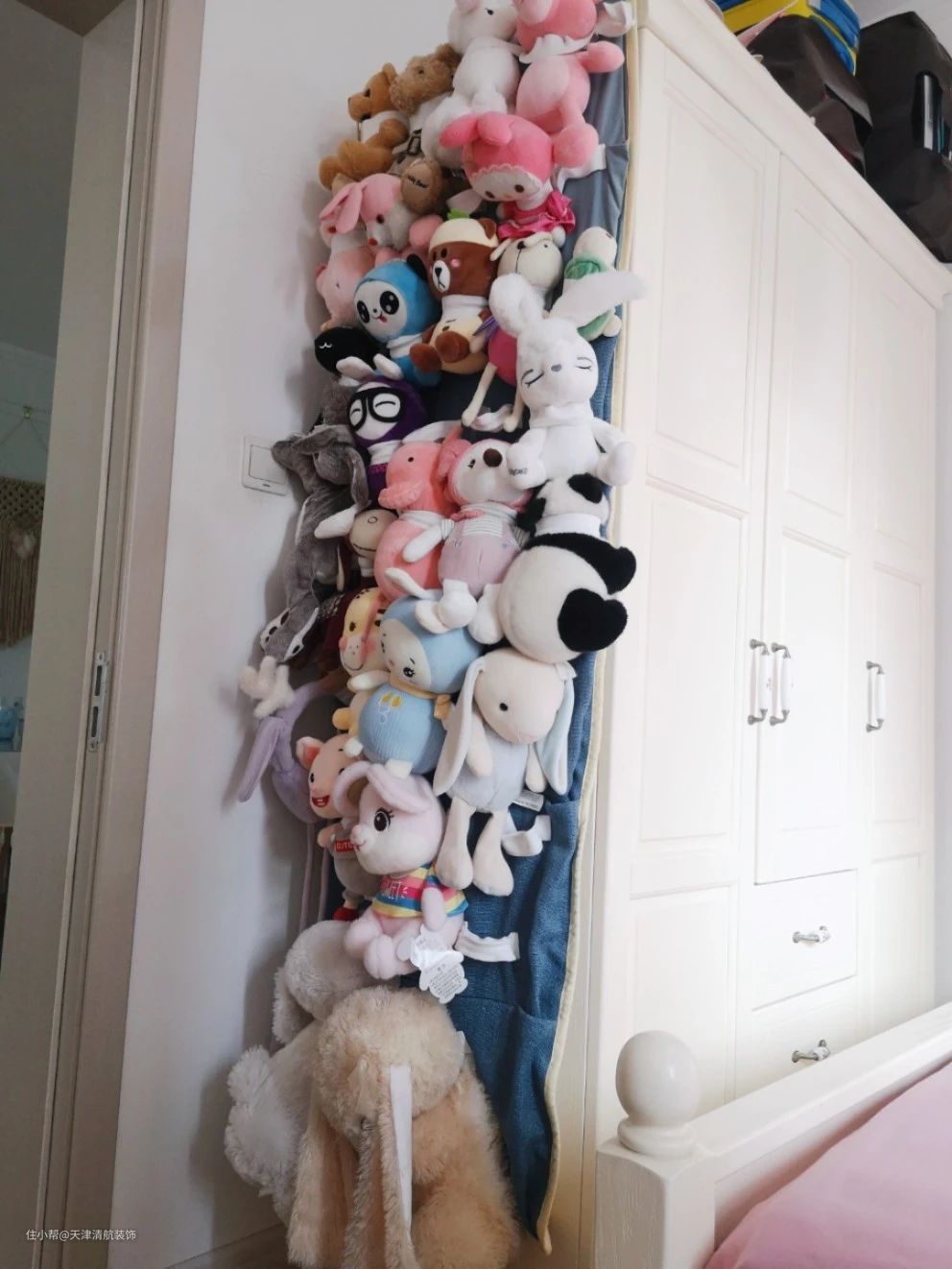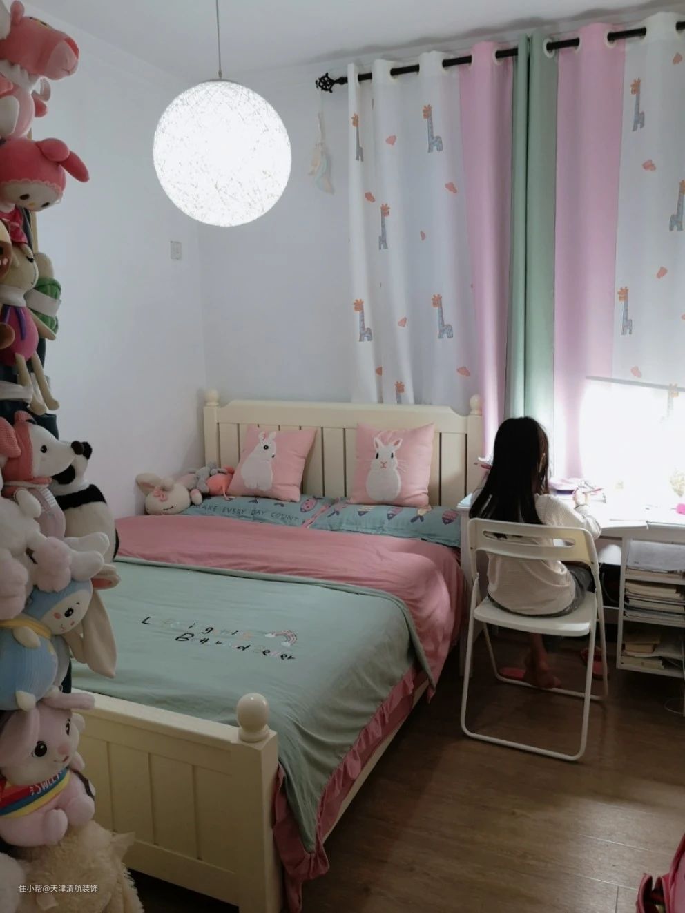 女儿房其实屋主已经重新改造了,更符合自己女儿的需求。布置一张单人床,旁边书桌柜,可以非常方便家里小孩写作业。衣柜侧面屋主自己弄的,家里很多布娃娃都有序收纳起来,特别实用。可以起到很好的装饰效果,让人看了都喜欢。安装的吊灯非常喜欢,类似一个圆形月亮的感觉,视觉感很强,晚上照明亮度足够。