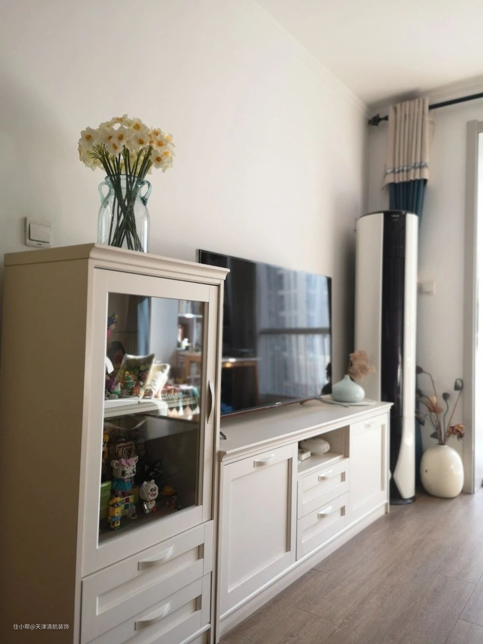 客厅电视背景墙没有做电视墙,如果当初做电视墙的话,肯定不会像是这样的效果。电视机直接放在电视柜上,左侧还可以布置柜子,可以提供大量的储物空间。一些小物件的东西,都方便装柜子,保持整洁与干净。