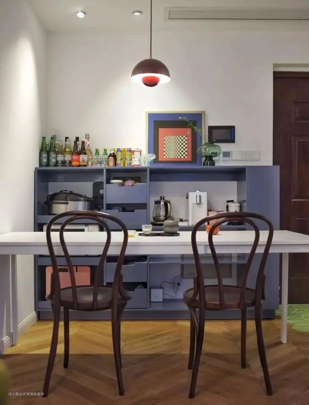 餐边柜是屋主根据需要定制的,我特别喜欢靠进户门方向设计的一排柜子,弥补了鞋柜太小的缺陷。
