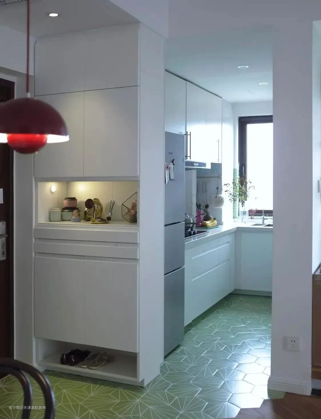 玄关的绿色六角地砖延伸至厨房,在白色墙面与橱柜的衬托下显得格外清新,在这样的厨房内烹饪菜肴,我想心情都是美美的。