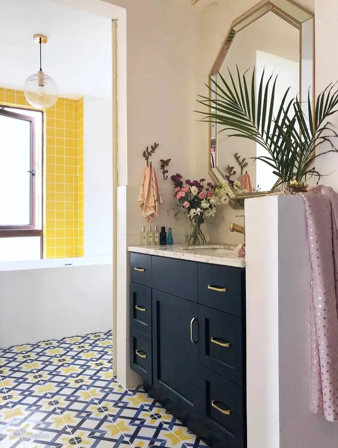 卫生间干湿分离,与过道之间做了半墙隔断;落地浴柜配抽屉代替了镜柜的收纳功能,比装镜柜视觉显宽敞。