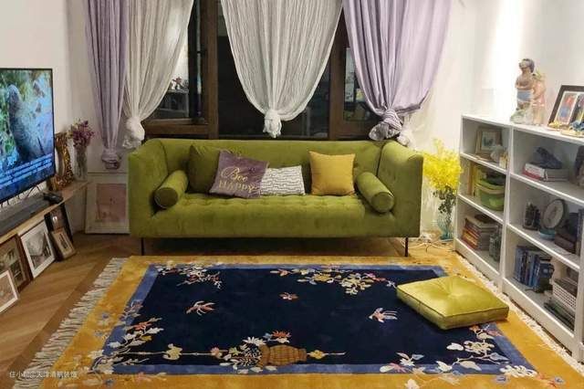 大白墙是百搭的,冬天换上铁锈红窗帘与果绿色沙发撞色一样非常融洽。