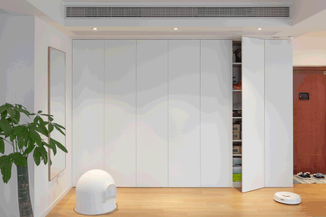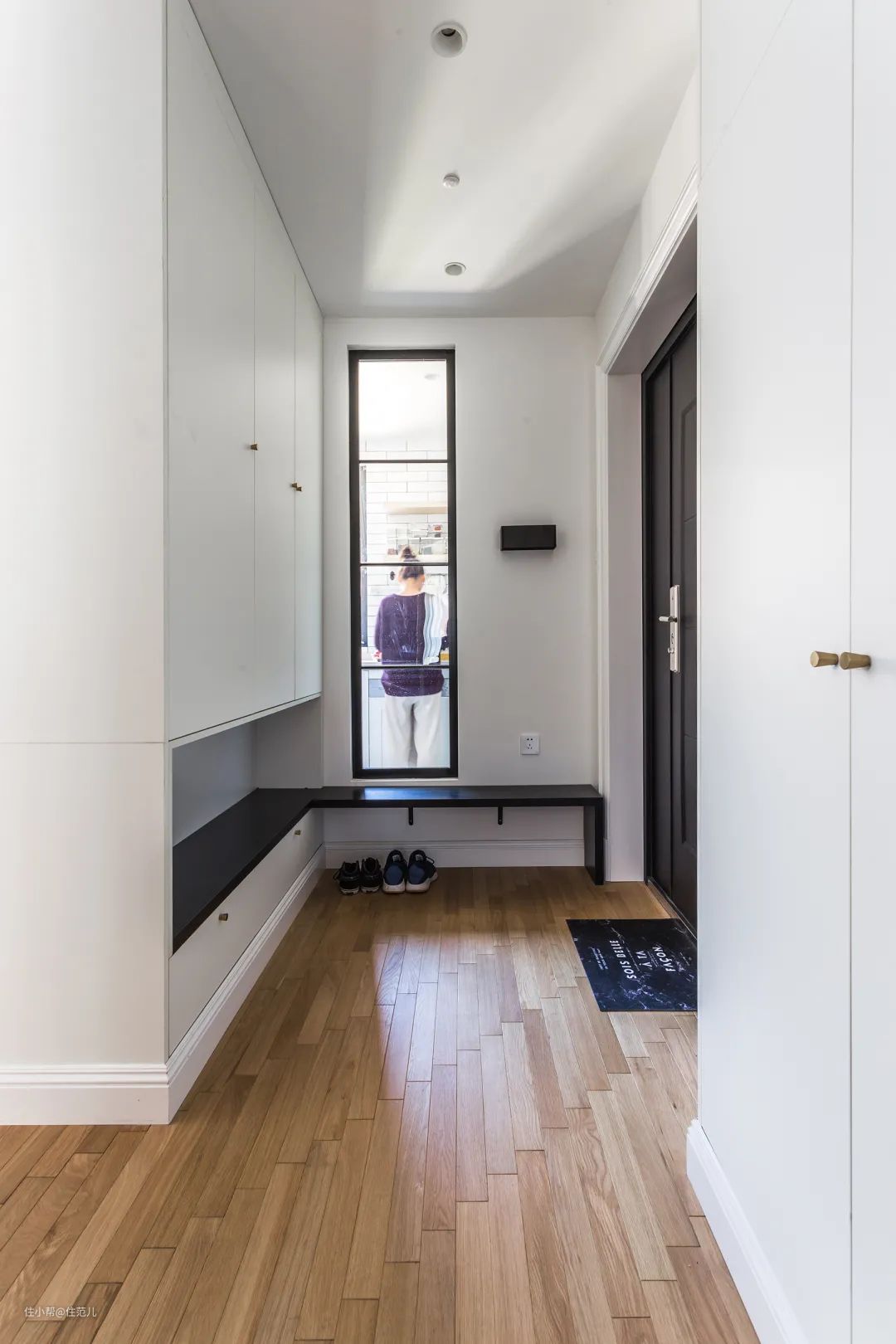 很多小户型家里没有条件做玄关,但我们仍然建议做一个简易的“落尘区”,可以在这里换鞋、放外套。