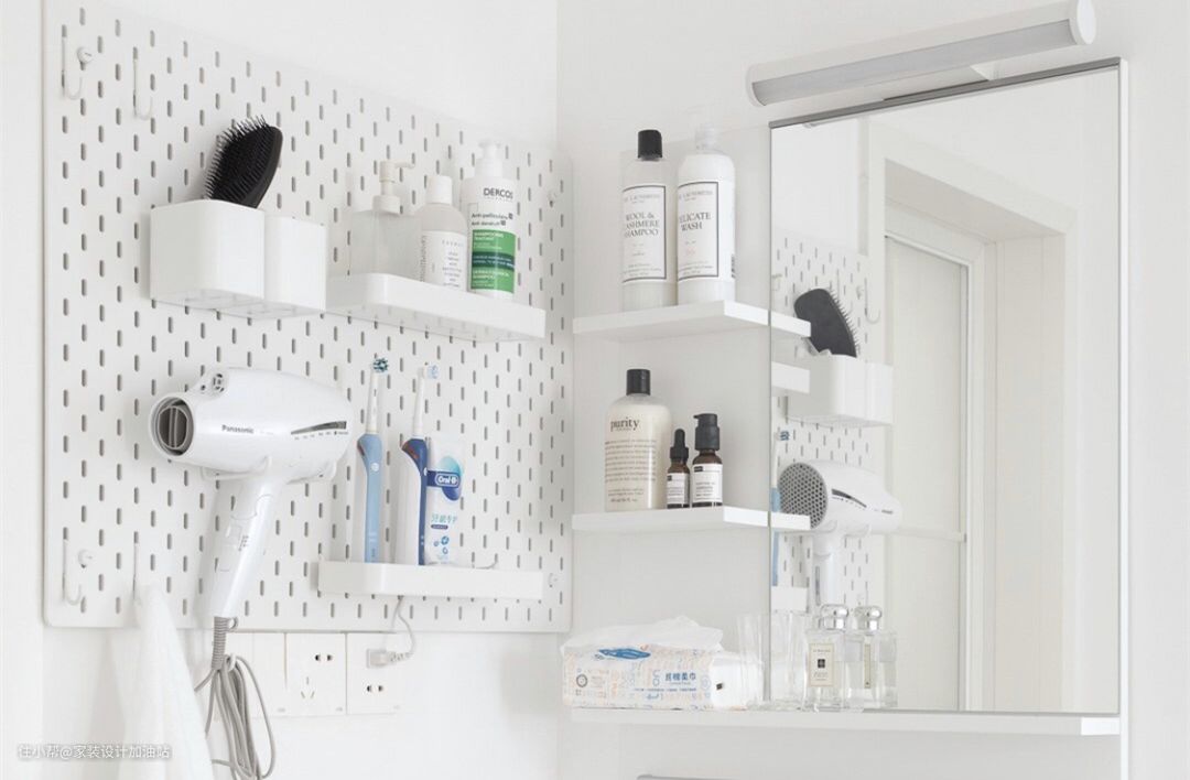 可是做镜柜使用起来需要一直开合,也相当不方便,所以直接在干区墙面壁挂了洞洞板。