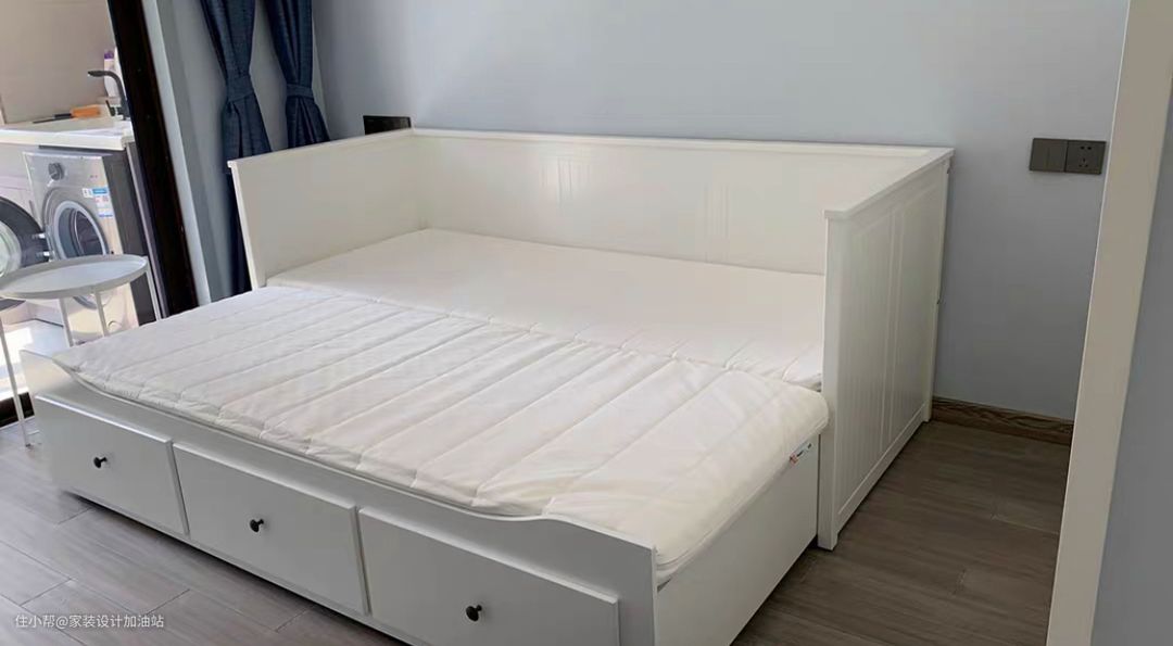 正常的时候可以当沙发使用,展开后有可以当床,最底层还有三个大抽屉,能用来做收纳。