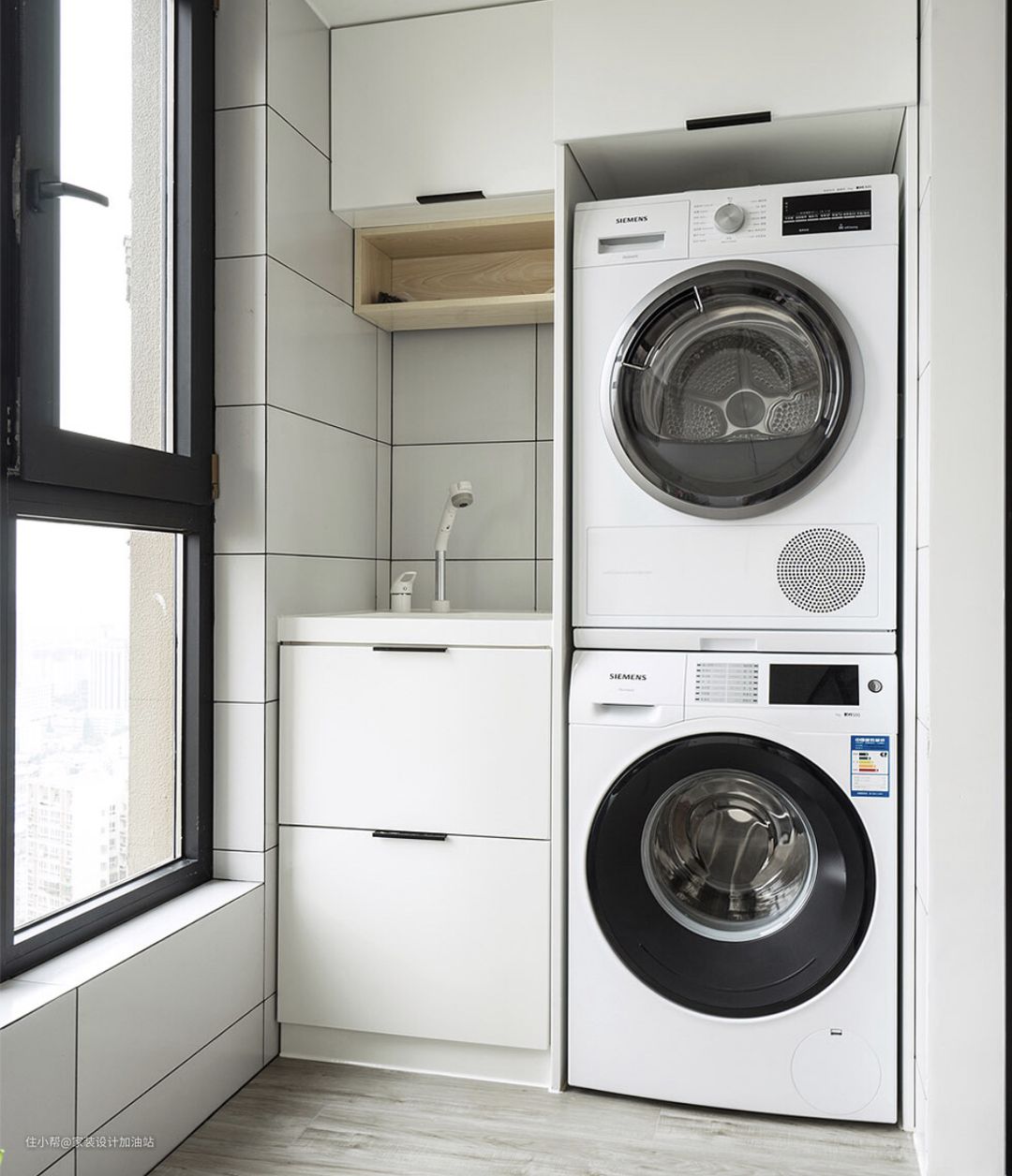 13、阳台没做晾衣杆,用了烘干机和洗衣机组合