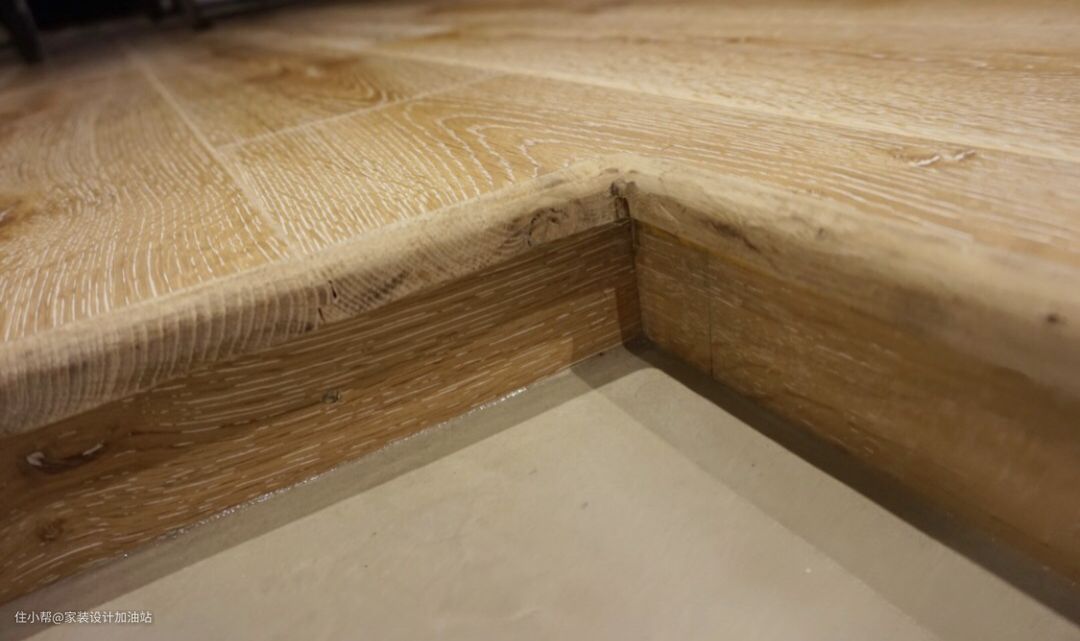 比较难的是下沉式玄关的收口问题,其实直接把收口处地板打磨出直角,侧面用地板贴好,完工后,下沉式的位置,做水泥自流平,就完美搞定了。