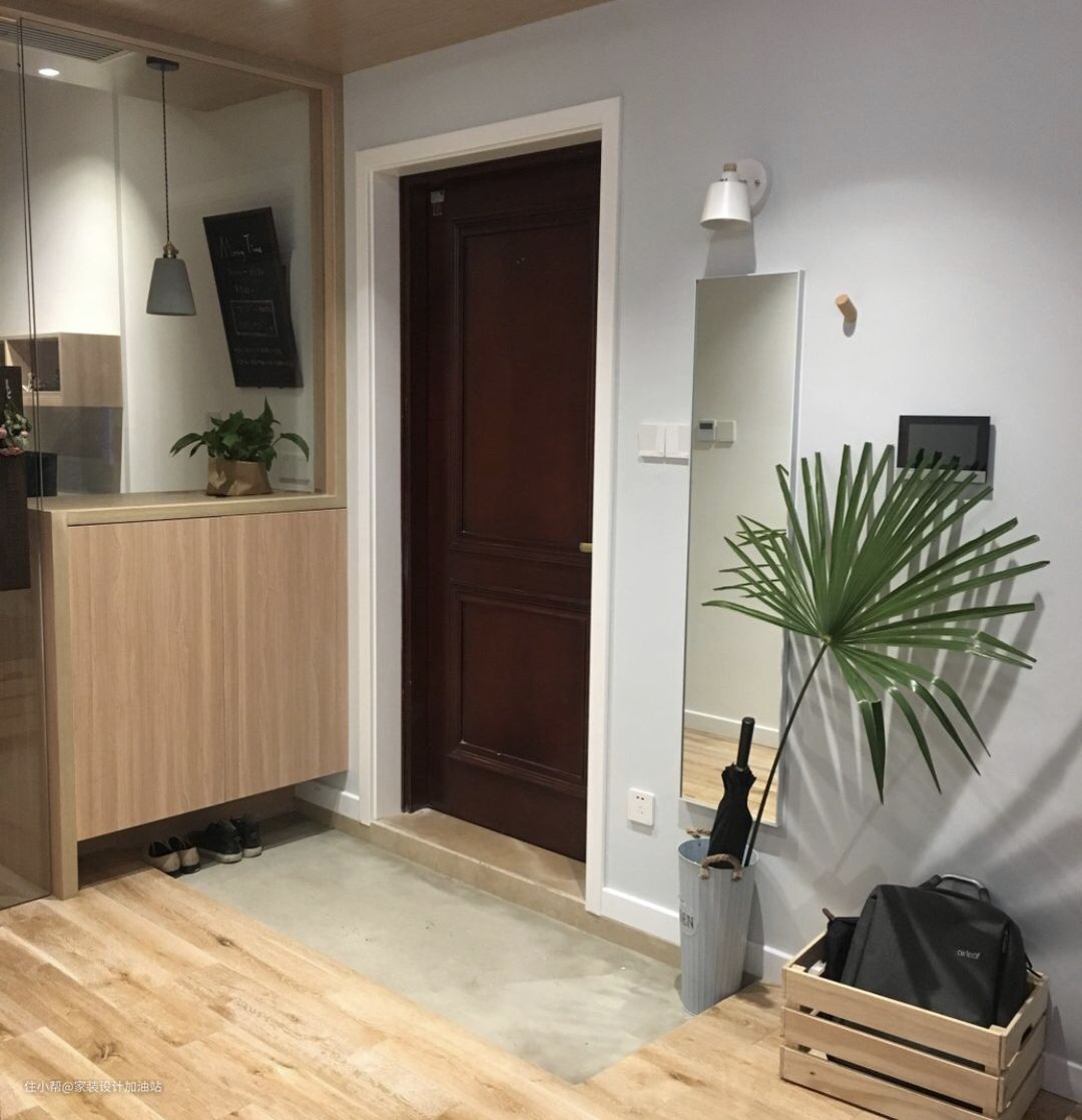 做下沉式玄关后,室外鞋、快递等物品,就可以放在这里,室内拖鞋则放在木地板区,划分非常明确,减少了灰尘进入室内。每次回家,再不会忘记换鞋,还非常有回到家的仪式感,连家里长辈都齐称赞。