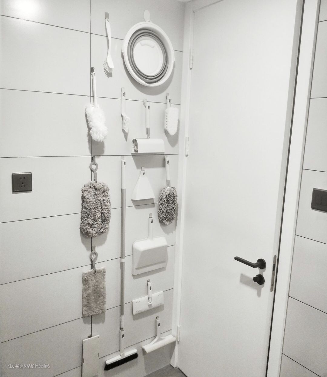 就把卫生间墙面利用起来了,一开始只是壁挂几个常用的清洁刷头,随着入住,清洁工具越来越多,墙面壁挂的物品也就多了起来。