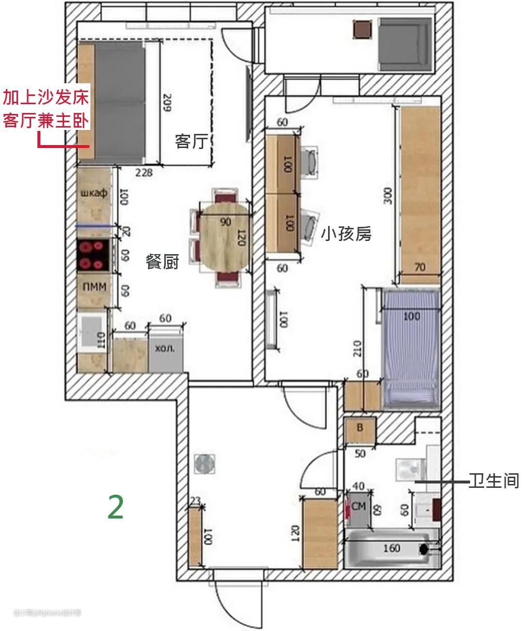 和方案1相同,为了节省空间,厨房挪出部分空间做为客厅使用,同时改用沙发床,到了晚上,客厅也能兼做主卧。