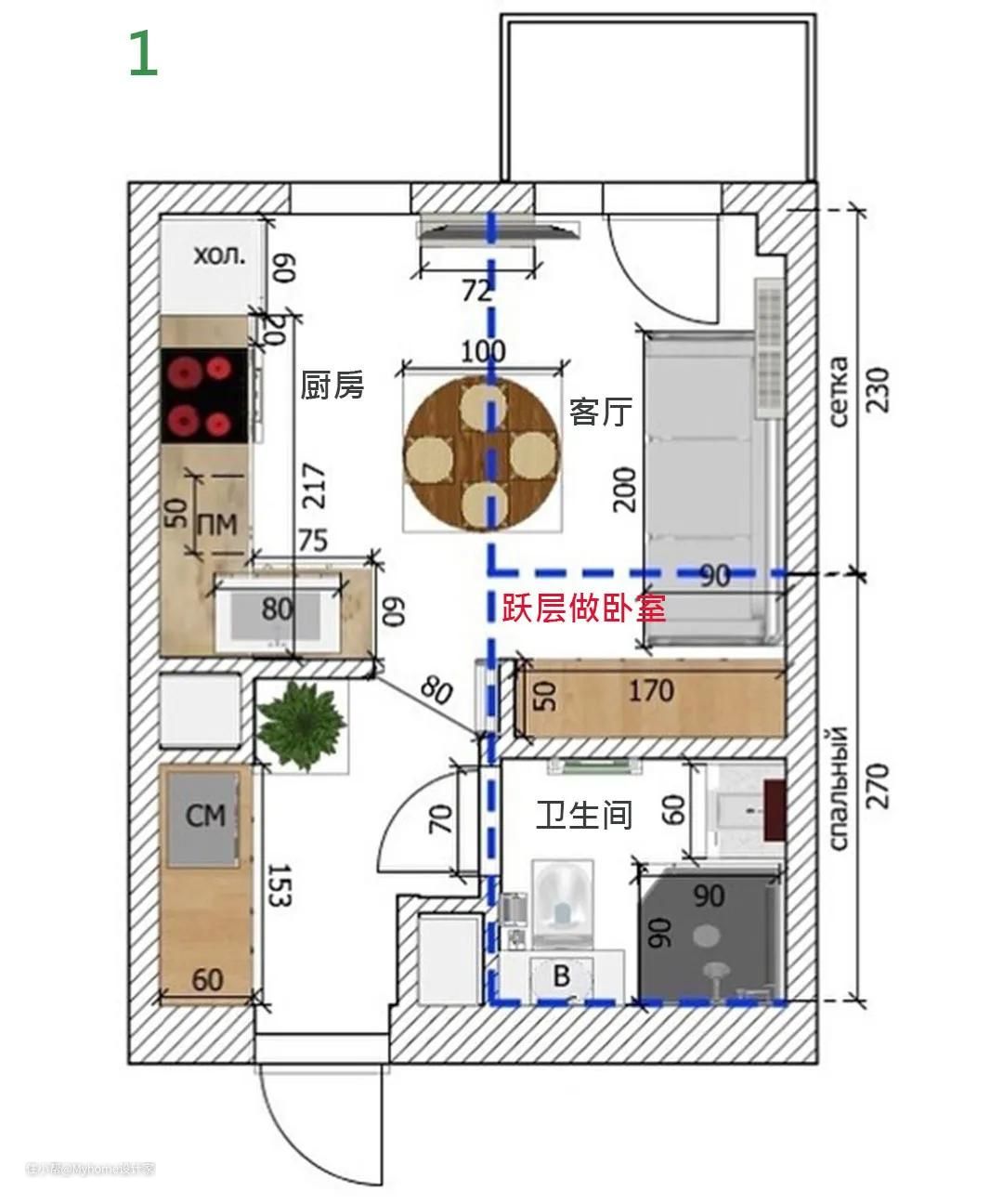 在客厅与卫生间上方增设80厘米高的跃层,能当作卧室使用。开阔的面积,即便家人留下住宿都没问题。从下图看,蓝色虚线的范围即是跃层。