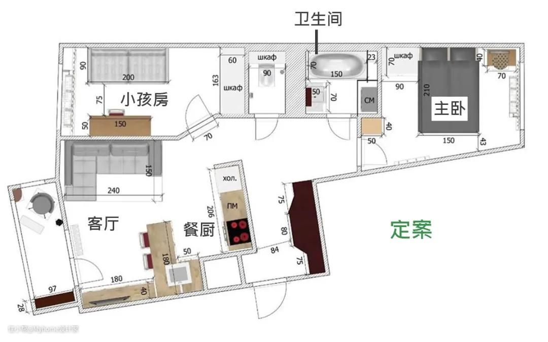 和方案1相比,方案2将主卧与小孩房对调,同时小孩房的门口改为斜角设计,能消弭在对角线柜体的尖锐感受。