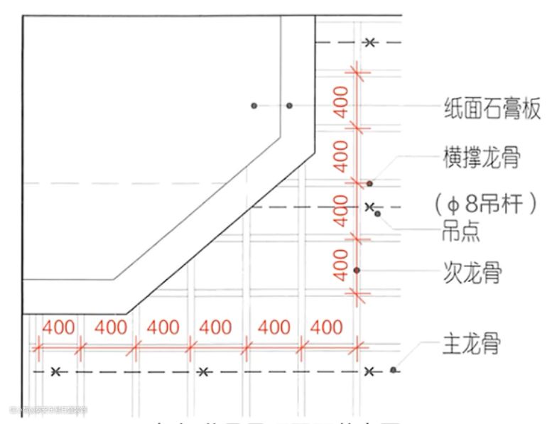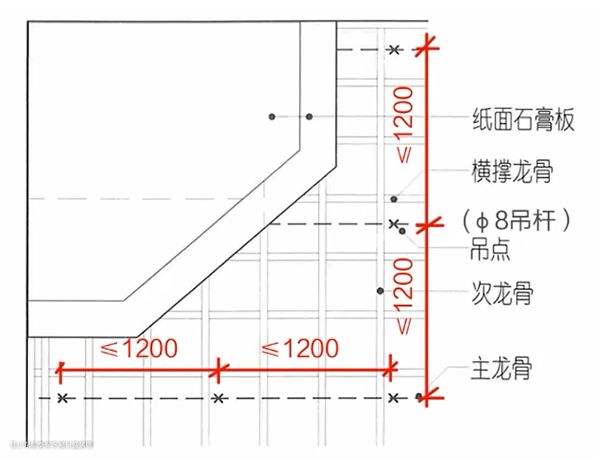 在吊顶龙骨末端,吊杆需距主龙骨末端距离≤300mm。为防止间距过大,吊顶末端不受力,影响吊顶的安全性。