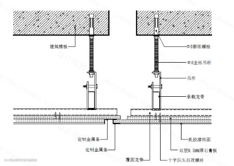 另外,不管侧板是木板还是金属骨架,均需单独安装吊筋,且间距建议≤1200mm;若侧板造型较重,则需采用角钢作为吊筋,吊筋与木侧板造型用对接螺栓固定。