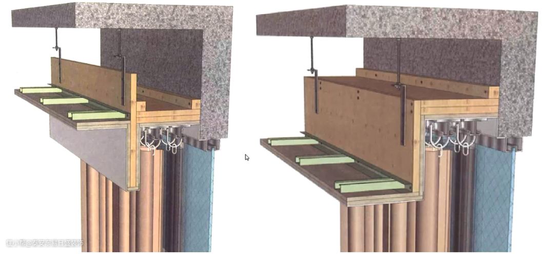 窗帘盒的把控要点:多考虑固定窗帘轨道的承载力,窗帘越重,基层就需要越牢固,越重就需要越强的握钉力,比如采用9mm或18mm的层板来承载窗帘轨道的重量。
