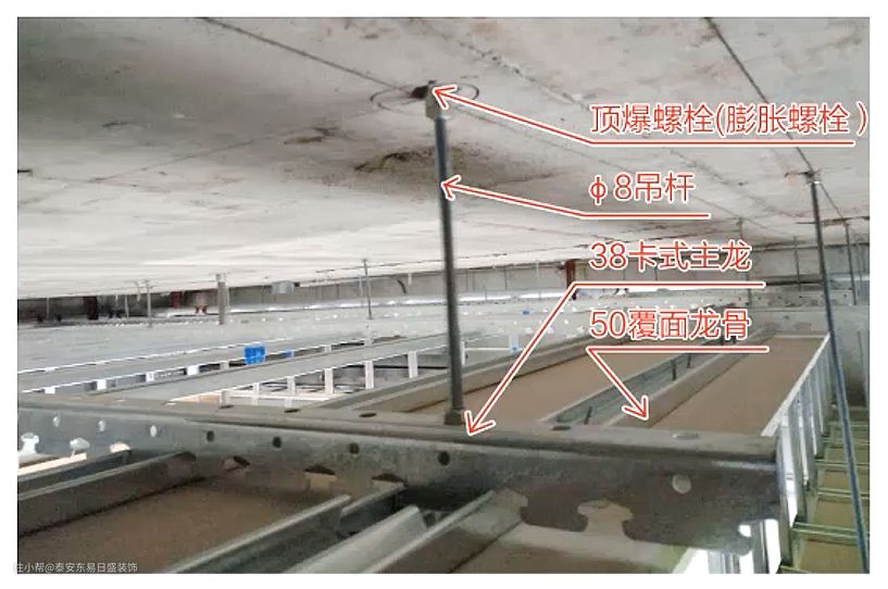 悬挂龙骨部件解析:主龙骨+吊件+吊杆,承载整个吊顶的全部受力,常见搭配:60mm主龙骨+配套吊件+φ8吊杆。