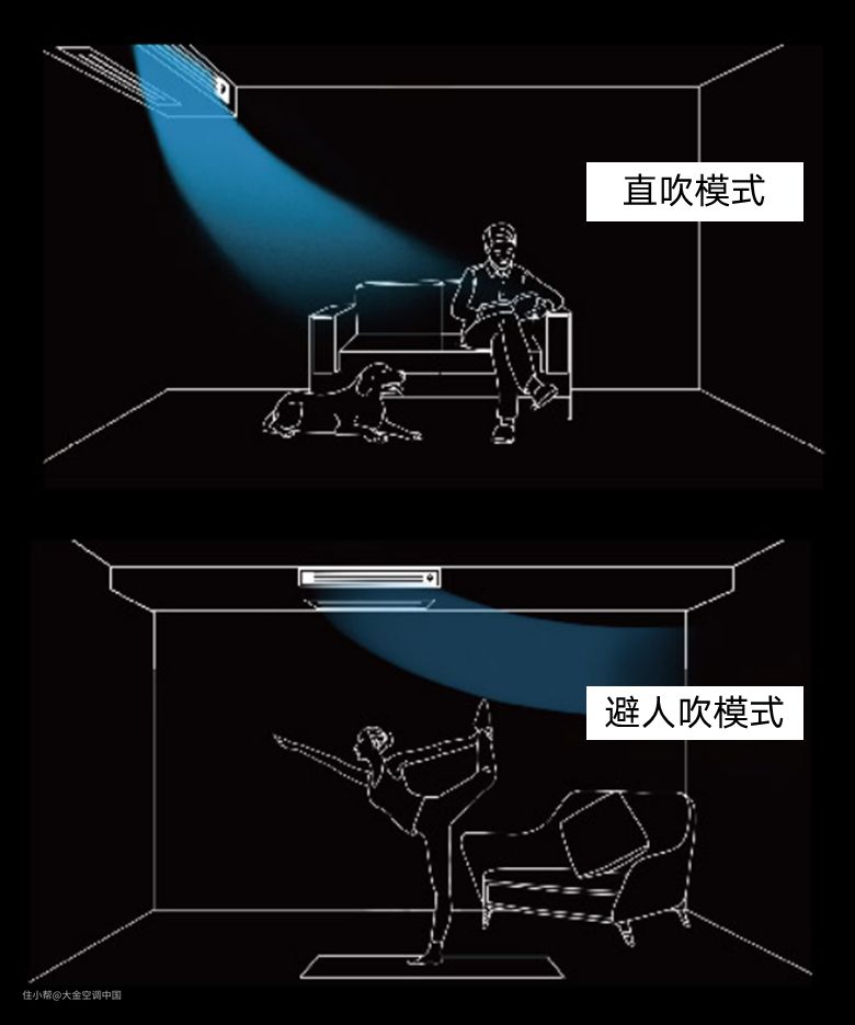 空调的送风方向在很大程度上是会影响舒适度的。由于冷空气向下沉,而热空气反之,因此在制冷状态时最好把气流引导向上吹,避免冷气对着人的头部直吹,让冷气自上而下地循环。