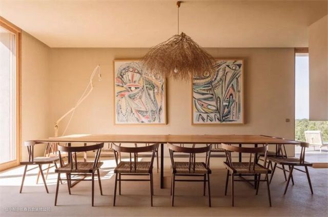 餐厅也是非常淳朴的风格,细长的木头桌椅别具美感,让空间更加轻盈。树枝灯具与周围的环境非常契合,墙面上还有两幅低明度色彩的艺术绘画作品 ▼