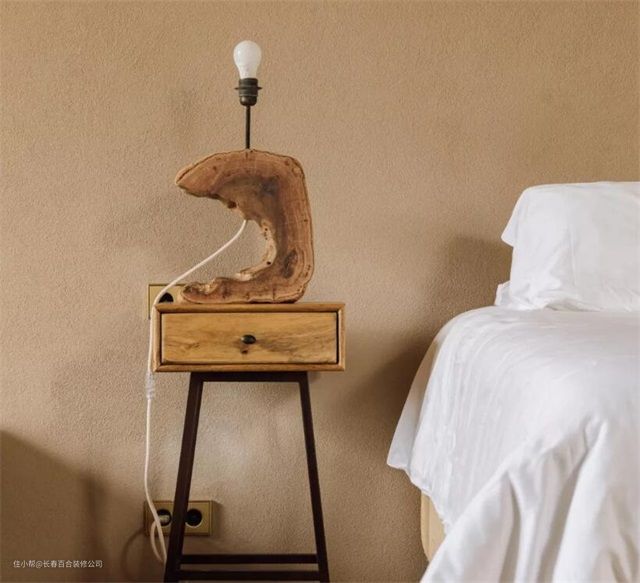 床头柜和灯具具有简单的线条美感,都采用了原始的材料 ▼
