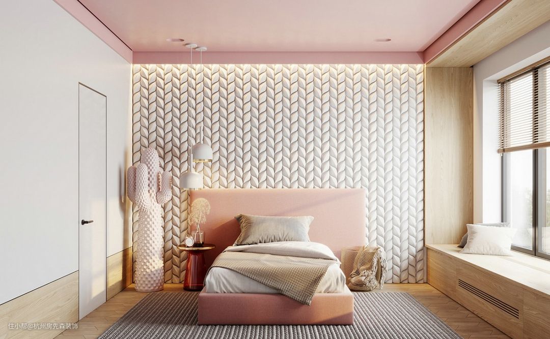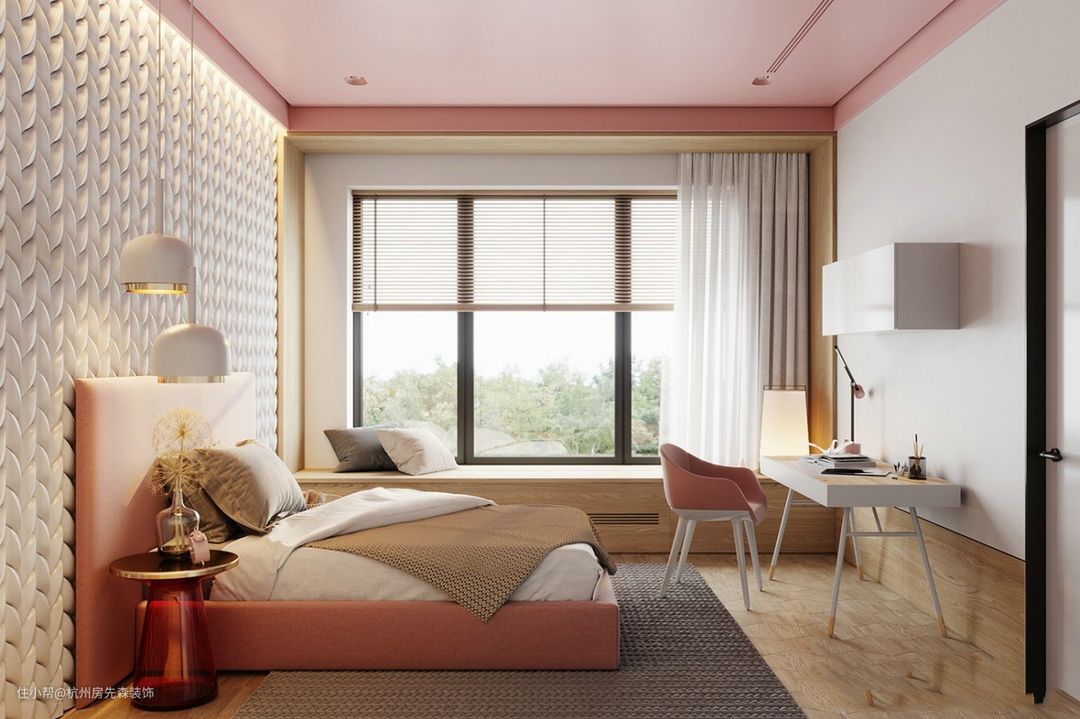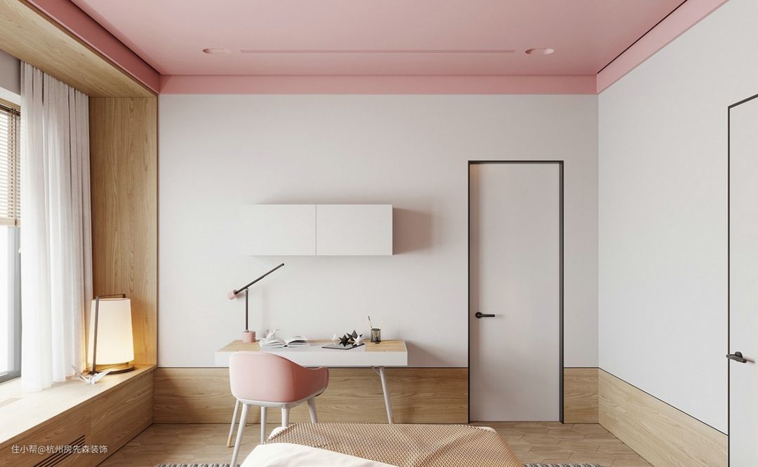 ▲ 次卧里面的装修在白色与木色之外,加入了部分粉色系,使次卧里更多了一些甜美温柔的生活气息,看里面的装饰陈设,似乎是为家里的小公主打造的,每个角落都很精致。