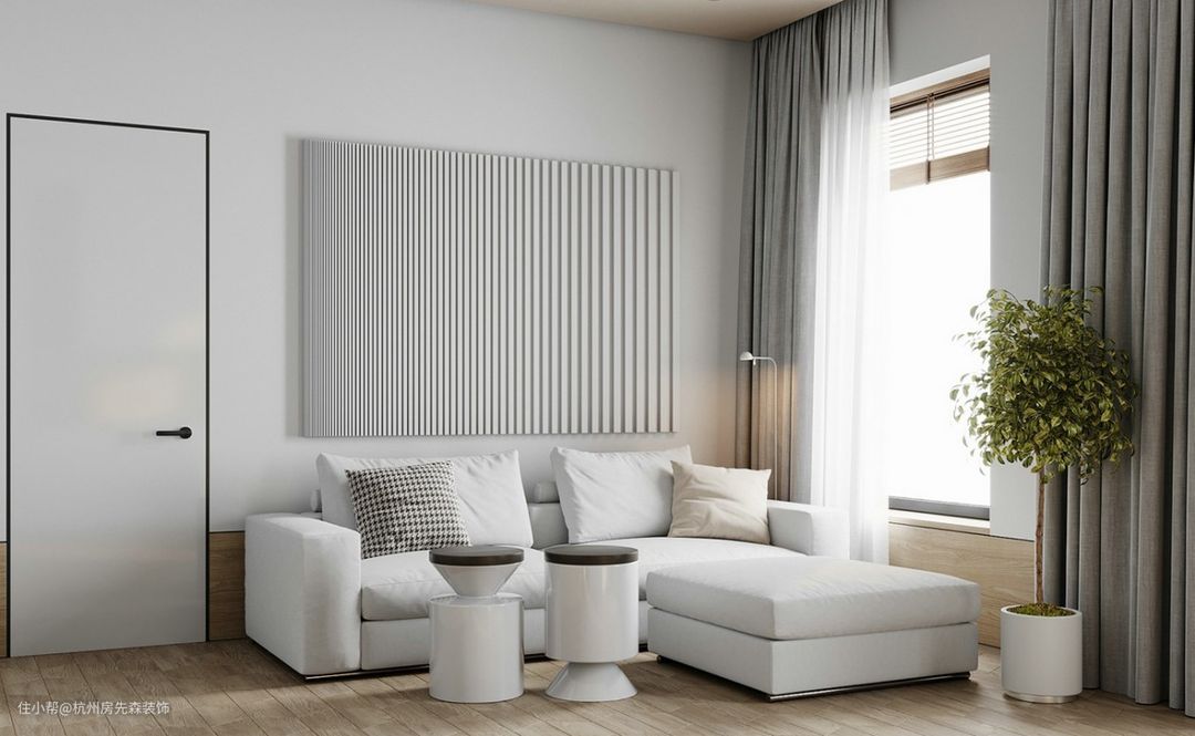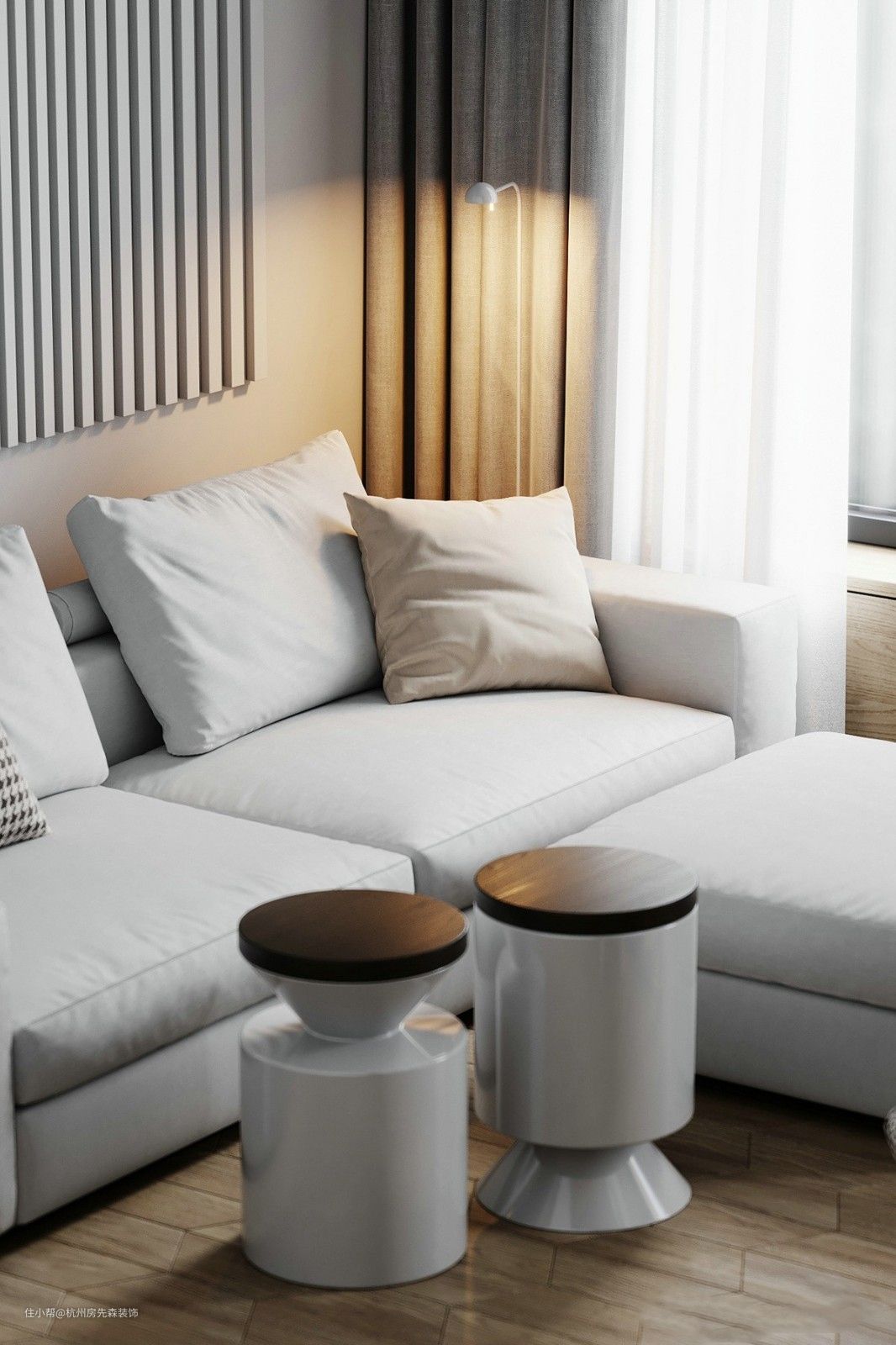 ▲ 客厅这边没有过多的装饰陈设,一组浅灰色的沙发,搭配两个小茶几和一个极简造型的落地灯,背景墙上也只装了一块同色的木格栅作为点缀,整个空间显得简约却极富高级感。