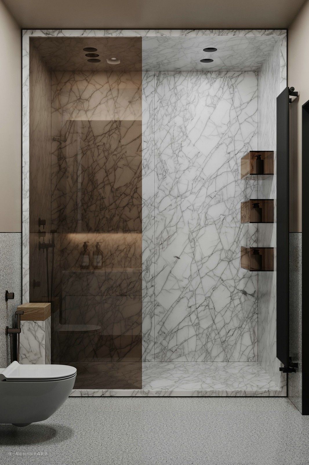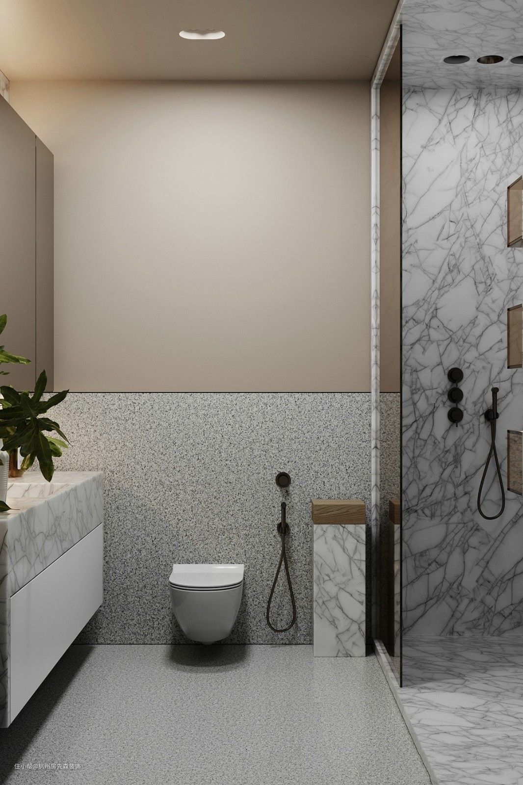 ▲ 最后就是卫生间了,卫生间里的装修采用了多种材质相组合,但配色上又很统一,使得整个空间显得既和谐又富有层次感,石材的台面与墙面,也将整个卫浴区衬托得很高级。