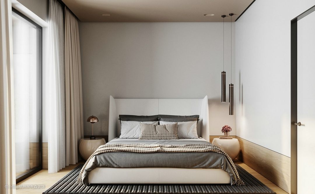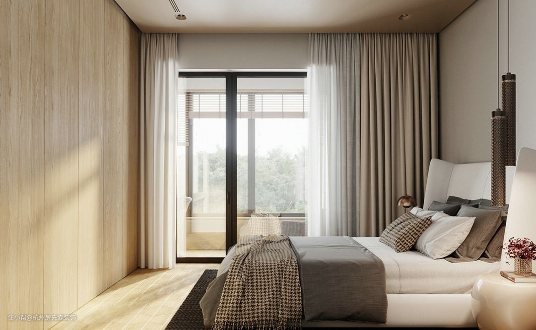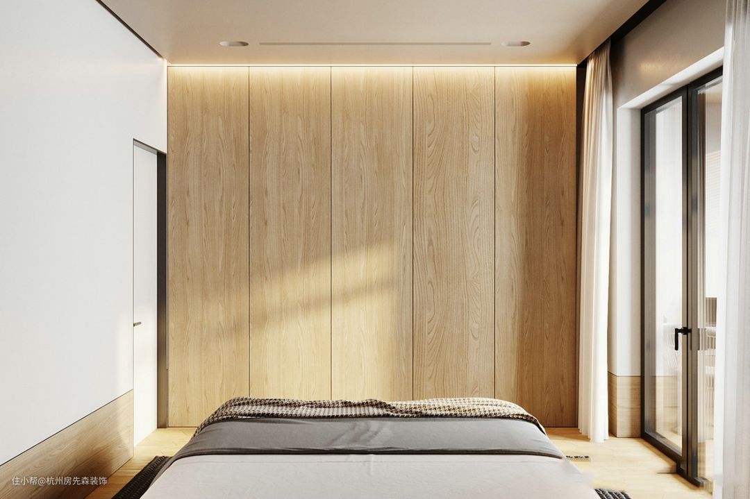 ▲ 主卧一进门,便可以见到门口有一组通顶的木色衣柜,同样采用了极简的无把手设计,与造型简约却极具质感的家具和灯饰组合在一起,将整个空间衬托得整洁清爽极了。大面积的木色调,也能提升室内的温暖氛围。