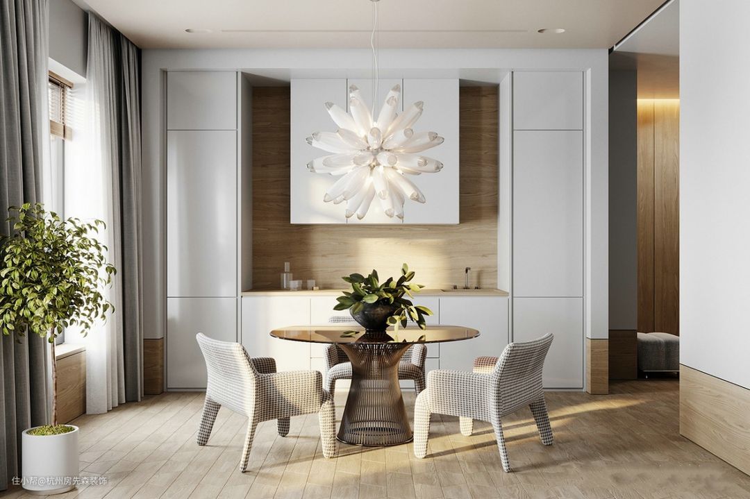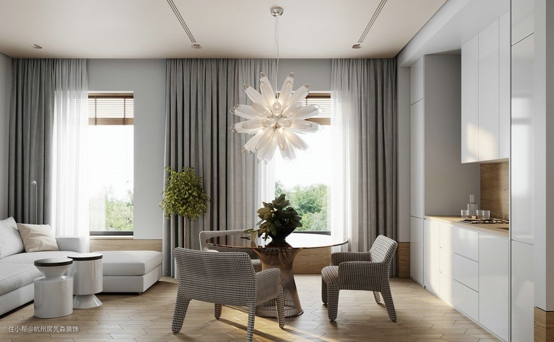▲ 餐厅这边选用了一款茶色的圆形餐桌,与黑白格的餐椅搭配在一起,显得高雅而有格调,顶上的一盏花型吊灯,更是提升了整个空间的气质与颜值。这里之所以选择圆桌而非方桌,是为了打破整个空间太过硬朗古板的印象,让整个空间更显灵动轻快。从这个角度可以看到,客厅和餐厅两边的窗台,都拓宽成了飘窗的形式,与周围的墙面刚好形成一个整体。