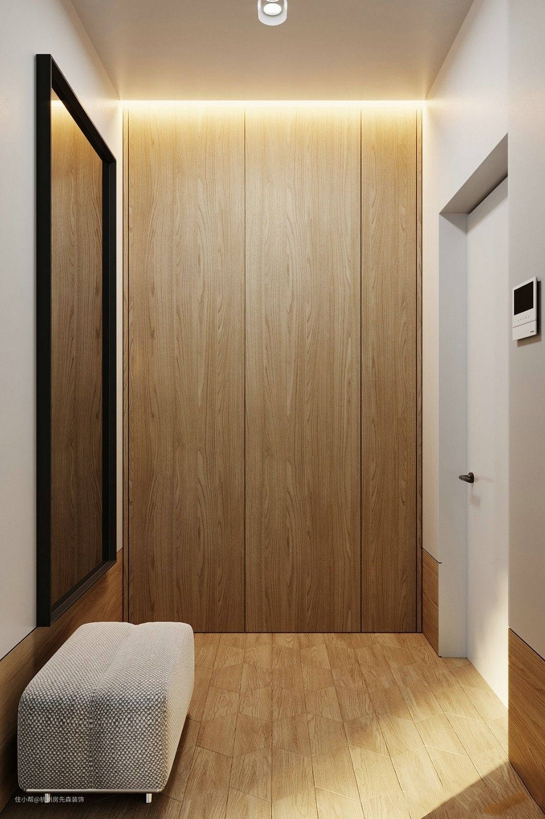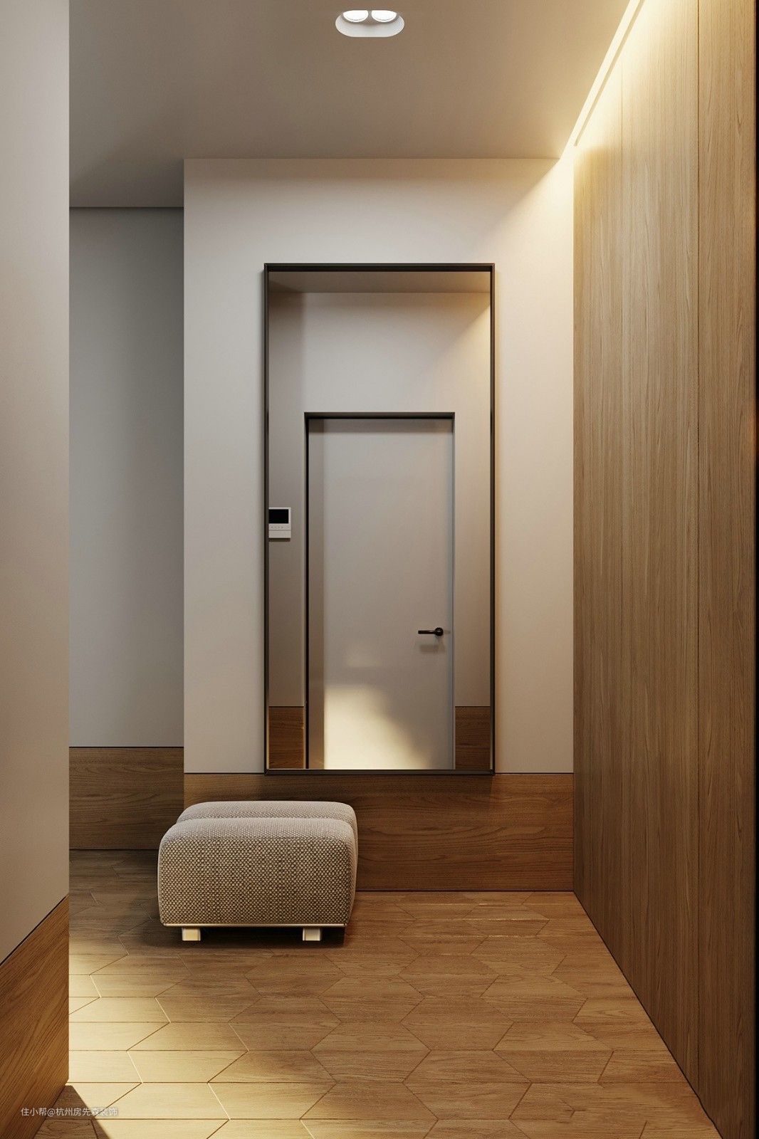 ▲ 这是玄关区,大门正对面安排有全身镜和换鞋凳,右侧则安排有一面顶天立地的衣帽柜,柜子采用无把手的设计,极简的造型与墙角的木饰面非常相称,与采用特殊工艺铺贴而成的木地板组合在一起,将整个玄关区衬托得利落又精致,而柜子顶上的氛围灯带,也增加了入户时的温馨感。