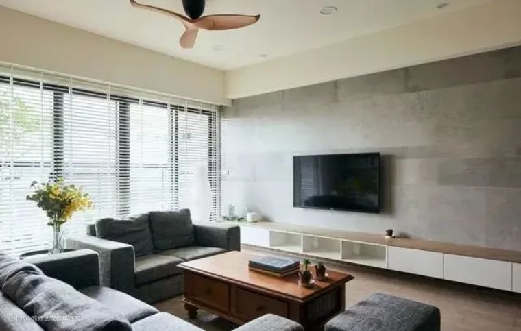 从餐厅望向客厅,客厅外面有一个大阳台,阳台搭配百叶帘,光线非常明亮通透,就算是电视背景墙选用水泥色的装饰,也不会显得空间暗。