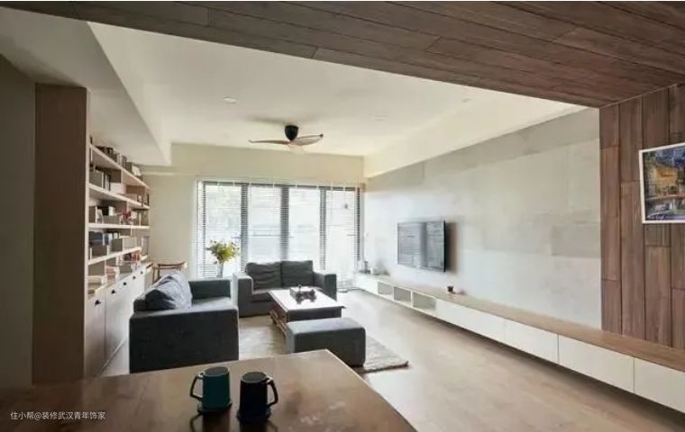 今天给大家分享一套原木风亲子住宅,沙发背景墙采用一整面墙书柜设计,好看又实用!