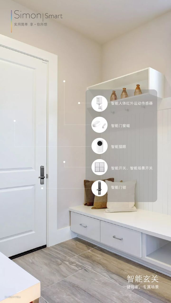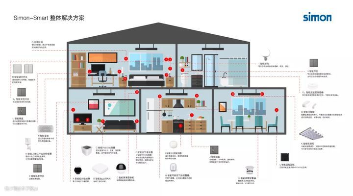 网关是智能家居设备的“大脑中枢”,收集信号,发送指令,实现产品之间智能联动。网关的话建议别墅或复式每层至少预留一个网关插座,尽可能覆盖更多智能设备。如西蒙电气Simon Smart智能家居系统是基于最新的Zigbee3.0通讯技术,Zigbee网关响应范围是10m就好,这个要提前规划好网关位置。