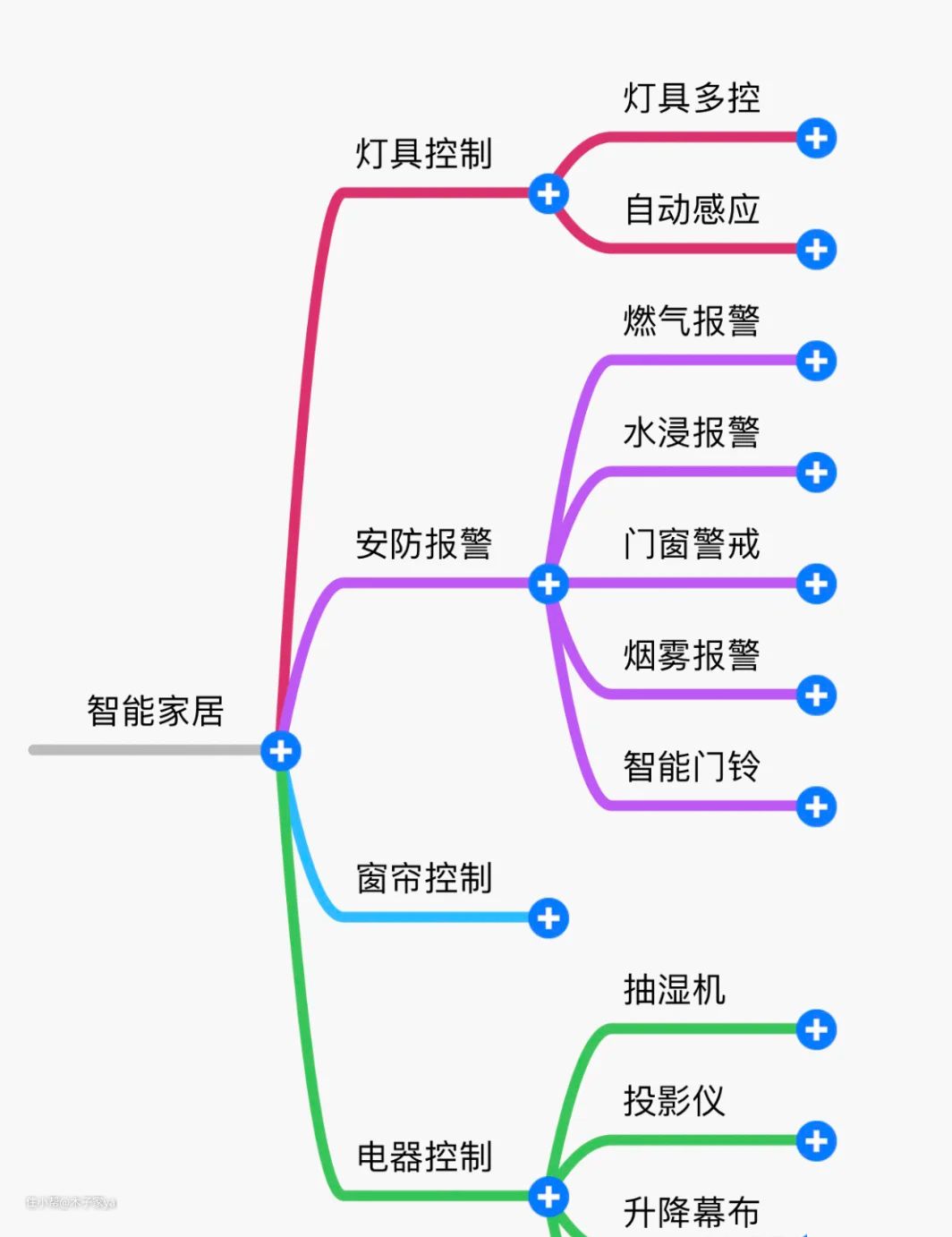 其实智能家居系统主要分为四个部分:灯具控制、安防报警、窗帘和晾衣架控制、电器控制。
