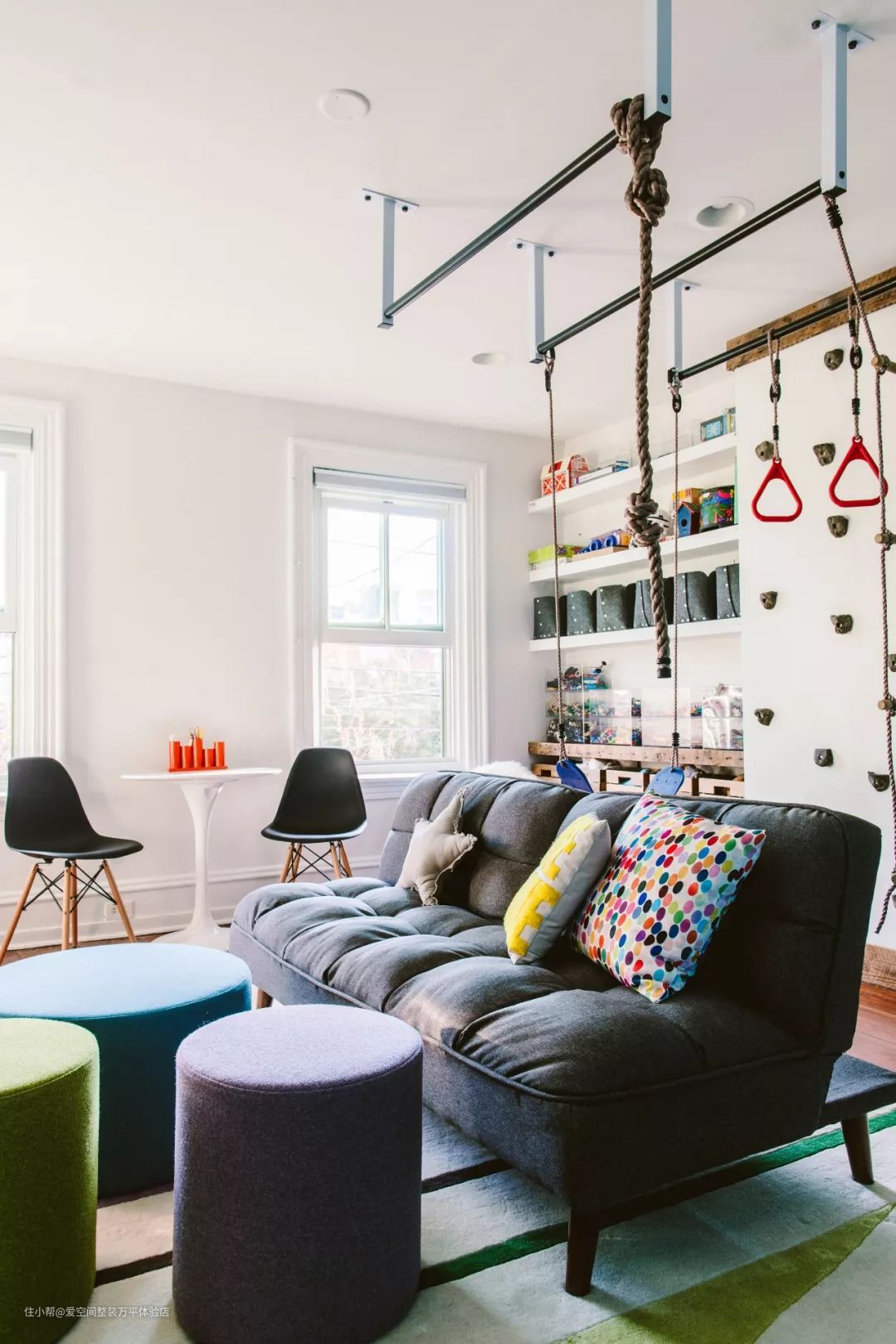 很多孩子都喜欢爬上爬下,但是在楼房中有太多的限制。将客厅的一角或者沙发的正对面,做成一个独立的亲子活动区,让孩子在家也能愉快的玩耍。