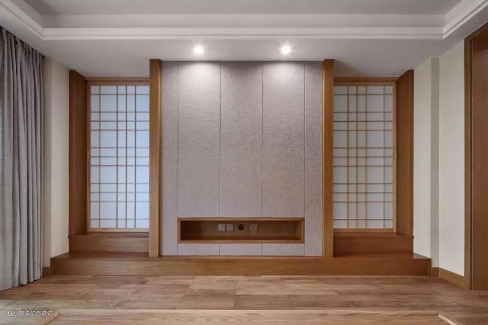 中式或日式风格装修中,屏风设计是一个增加韵味的元素,把屏风造型与房门融为一体,可以达到非常不错的隐形效果,而且屏风元素又能提升空间的档次效果。很多小伙伴们选择在电视墙两侧装了屏风推拉门,这样整体显得非常完整和谐。