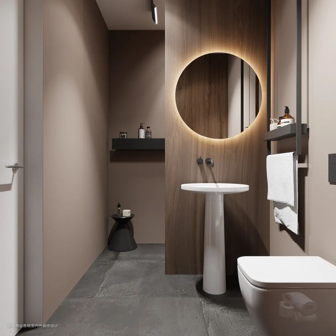 ▲洗手盆前方的木色墙面,装上圆形背光镜子,侧边的悬挂式收纳毛巾架,让空间显得极简时尚而实用优雅。