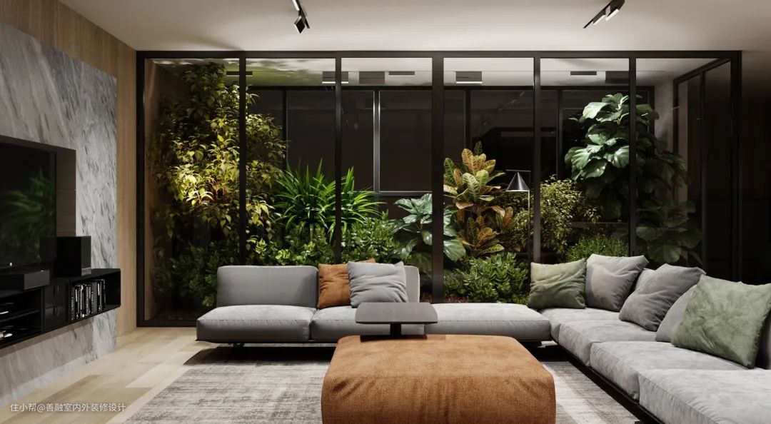 ▲客厅推拉门外摆上一堆的绿植,为室内引入了生机活泼的清新与惬意感。