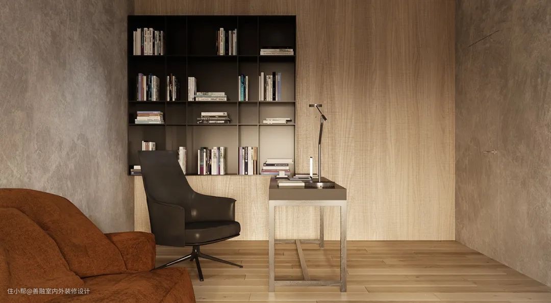 ▲书房在暖调水泥灰色墙面基础,侧边以木饰面+黑色书架的组合,布置上成品书桌椅,提供了一个舒适小资的工作空间。